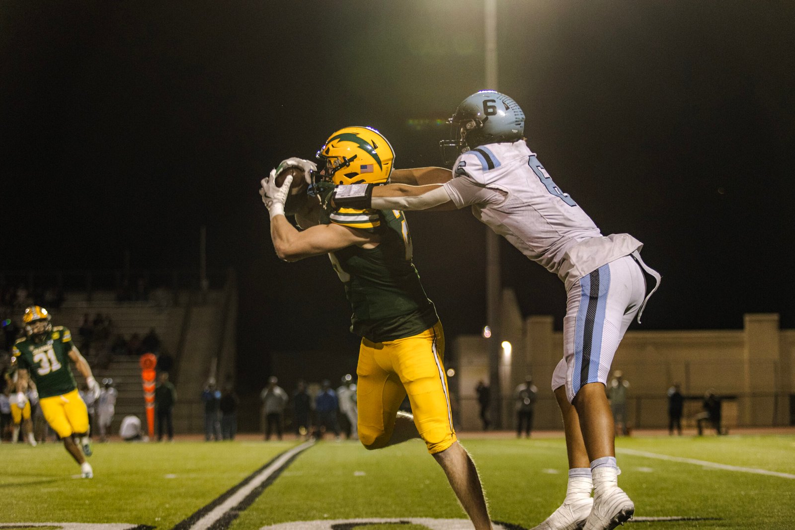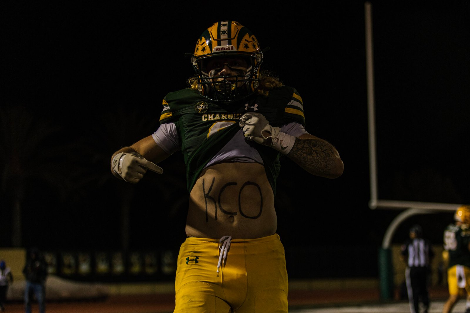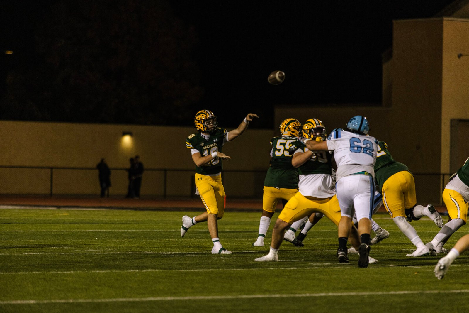 Quarterback Sam Thomson would start in his playoff game as a sophomore! In the second quarter, Sam Thomson threw an absolute dime to Aiden Brown, who would go on to score a 60-yard TD. Heading into halftime, the Chargers would be up 14-0.